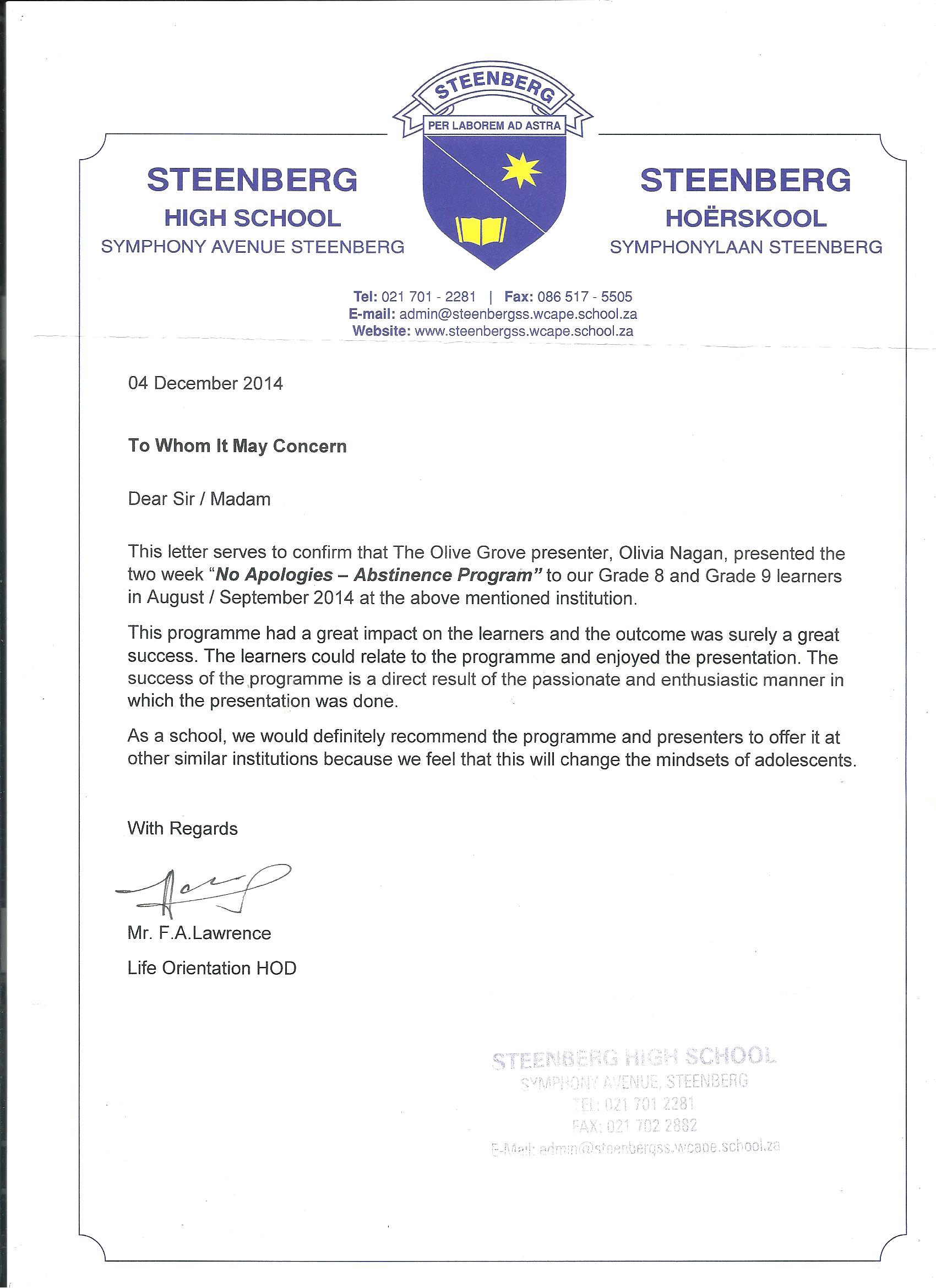 - Steenberg High reference letter